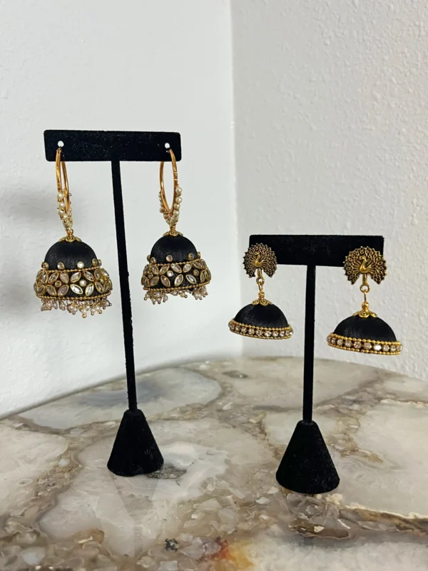 Pair the Grand Jhumka Earrings with a heavy lehenga set, or your favorite denim + tee look for an indowestern vibe.  The Petite Jhumka Earrings will bring a little chic, unique, fun to any ensemble, and we know that bangles are an effortless way to add a pop of color and polish. Whether you are looking for contrast in color, or a match, our silk thread jewelry sets are a great way to enhance your color palate. A wonderful option for bridal party jewelry or gifts.