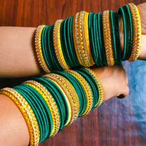 Whether you’re a bride embracing age-old customs or someone looking to infuse a pop of color into their ensemble, the Green and Yellow Silk Thread Bangle Chuda is a versatile accessory that adds a touch of elegance. The intricate patterns and textures on each bangle speak volumes about the dedication that goes into their creation, ensuring that you wear a piece of art on your wrists.