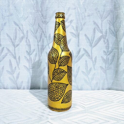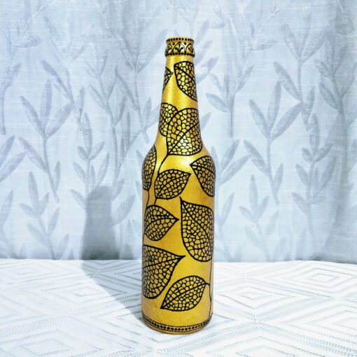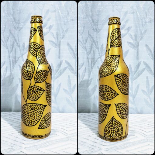 The bottle is painted with Golden metallic acrylic color designed with leaves pattern with Black which gives it a amazing look. It has been Varnished to increase the shine and longevity of the bottleart.? I have used empty glass bottle and painted it with dot painting style to reuse it.