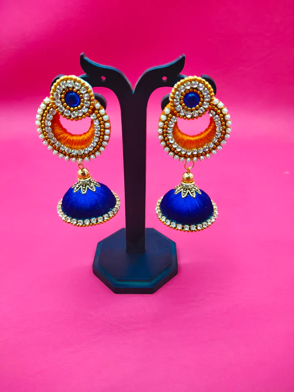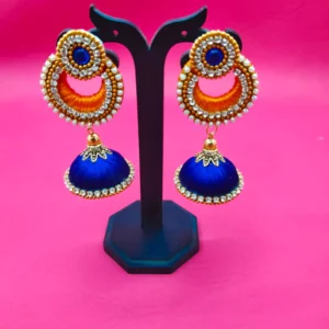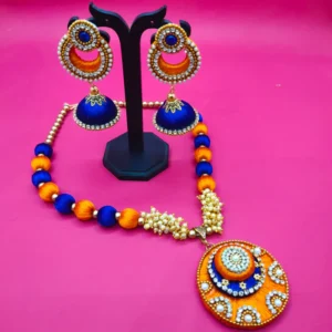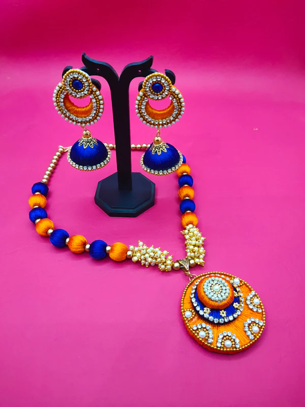 The necklace, a centerpiece of this set, continues the narrative with grace and grandeur. The interplay of silk and intricate design evokes a sense of opulence, making it a statement piece that elegantly adorns your neckline. Whether you’re pairing it with traditional attire or adding a touch of sophistication to modern ensembles, this necklace is a versatile masterpiece that enhances your elegance.