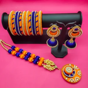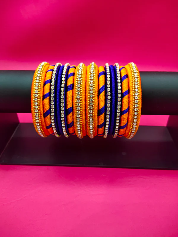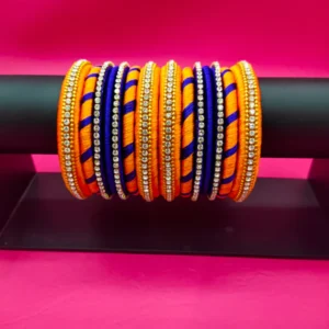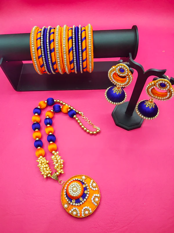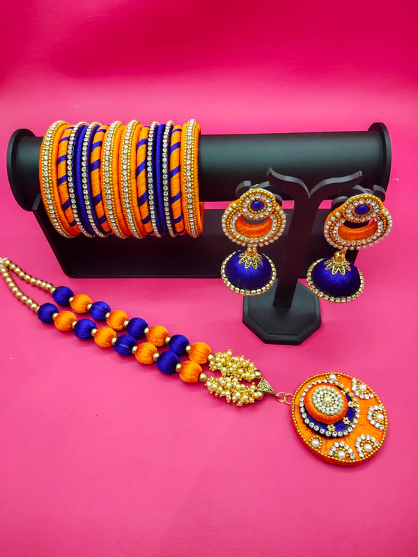 At the heart of this collection are the matching silk thread bangles that envelop your wrists with their gentle embrace. Meticulously woven by skilled artisans, each bangle carries the essence of tradition while embracing contemporary aesthetics. The delicate threads come together to form a tactile masterpiece, allowing you to wear a piece of art that tells a story of craftsmanship.