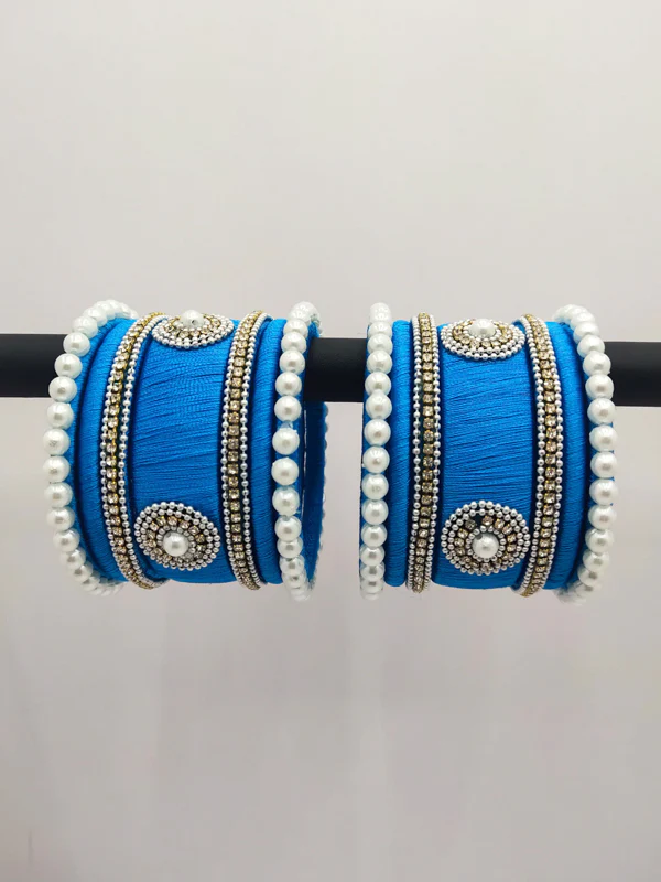 Sky Blue Silk Thread Bangles with Pearl: Elegance in Every Detail